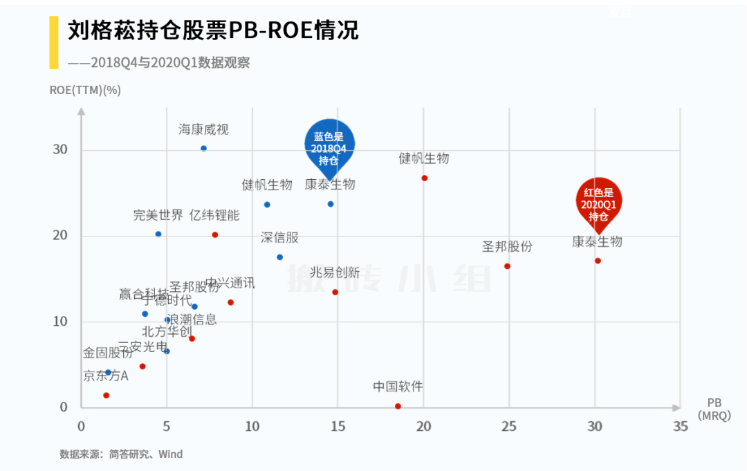 管理规模急速扩大后,风格和业绩,很难保持一样,持仓特点也会出现变化。我们从数据的角度,看了一下2018年Q4刘的组合,还有2020年Q1刘的组合,按照公募比较经典的PB(市净率)+ROE(净资产收益率)维度,看看刘在规模扩大前后的持仓特点: