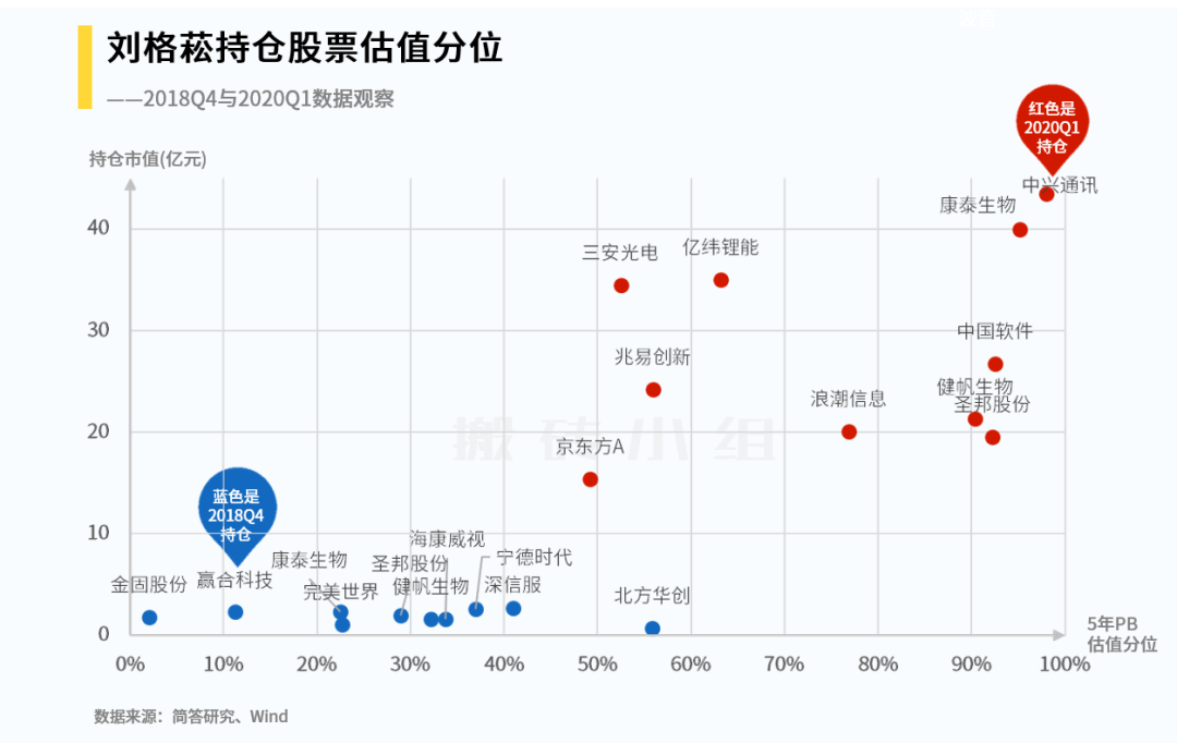 同样的,蓝色代表2018Q4持仓,红色代表2020Q1持仓,横轴是过去五年的股票估值(PB)分位,位于60%分位就代表比过去五年60%的时间要贵,纵轴是持仓市值。