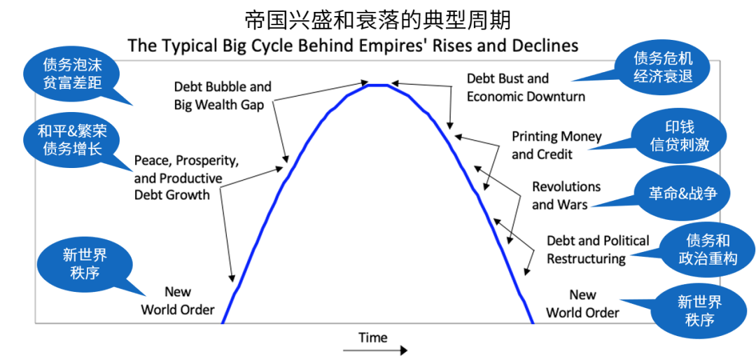 这个周期包括了从建立新的世界秩序,到和平繁荣发展,再到债务泡沫积累、贫富差距扩大,经济下滑,然后政策刺激,最后在战争与革命之下,建立新的世界秩序。
