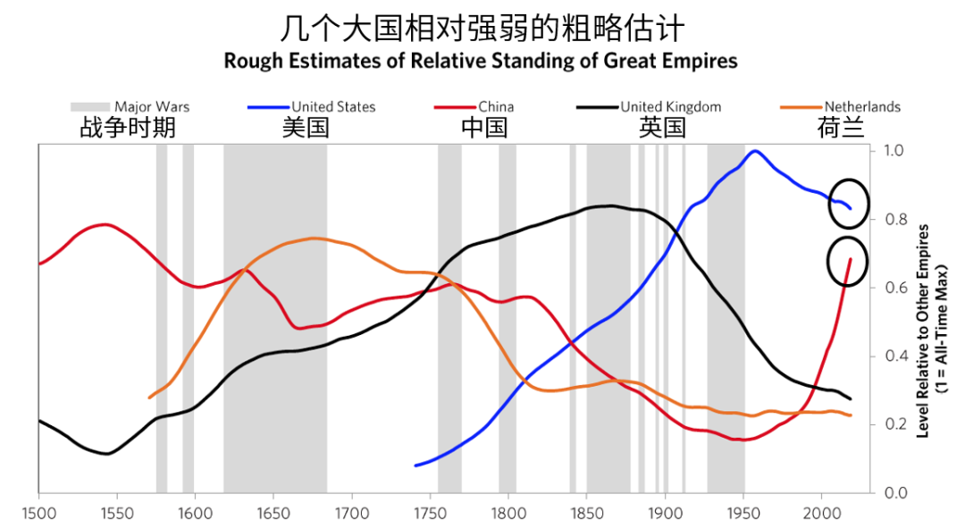 而最近的这次,达里奥又码了几十万字,详细回顾了人类历史上几大国际霸权的兴衰,其核心观点并不复杂,结合达里奥的图表更是清晰直观: