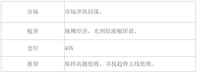 今天上半场市场还比较好,板块轮动冲高,电子、光刻胶、MCN等题材都有不错的表现。但经过3天的上涨以后,市场的抛压确实太大,2点左右明显感觉市场已经涨不动了,随后市场开启了一轮小跳水,盘后看仍然是处于窄幅震荡的范围。