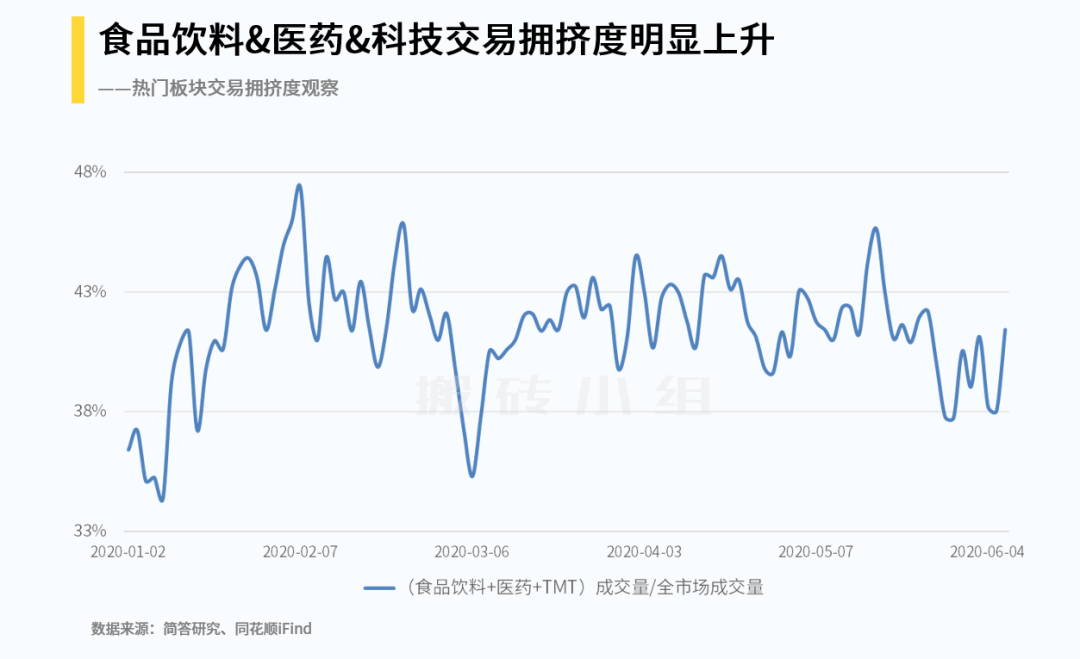 我们用一个指标——交易拥挤度,来观察板块的资金流入情况,它的计算方式就是板块成交量占全市场成交量的比例。