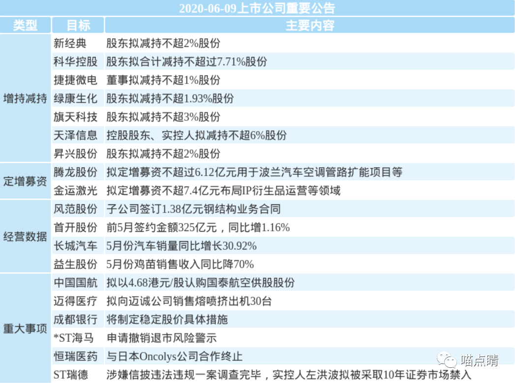 2、上海九百:公司控股股东九百集团于6月3日至6月9日期间集中竞价增持公司0.4081%股份,持股增加至20%,九百集团在未来十二个月无处置上海九百股份计划,并拟六个月内继续增持不低于5%。大股东用真金白银表态。