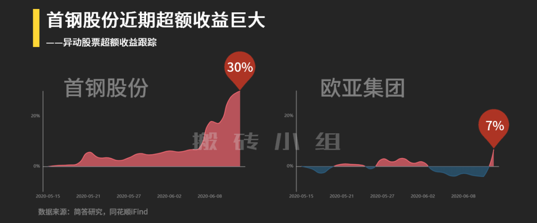 今天有小伙伴问我们两个公司,一个是写过的首钢股份,当年的核心逻辑就是业务转型、资产注入预期和资金举牌,不知不觉已经跑出30%超额收益了,这货最近根本不是钢铁股的感觉,很奇怪。