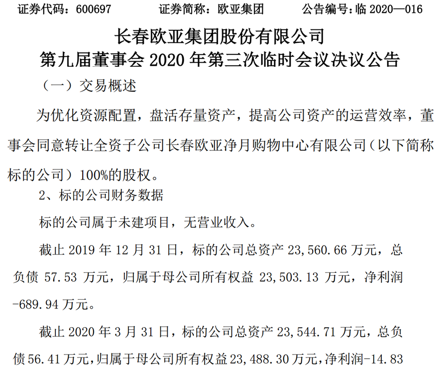 而在今年四月底,欧亚集团发了拟转让长春欧亚净月购物中心的公告,公司终于要对自有物业展开些运作了。