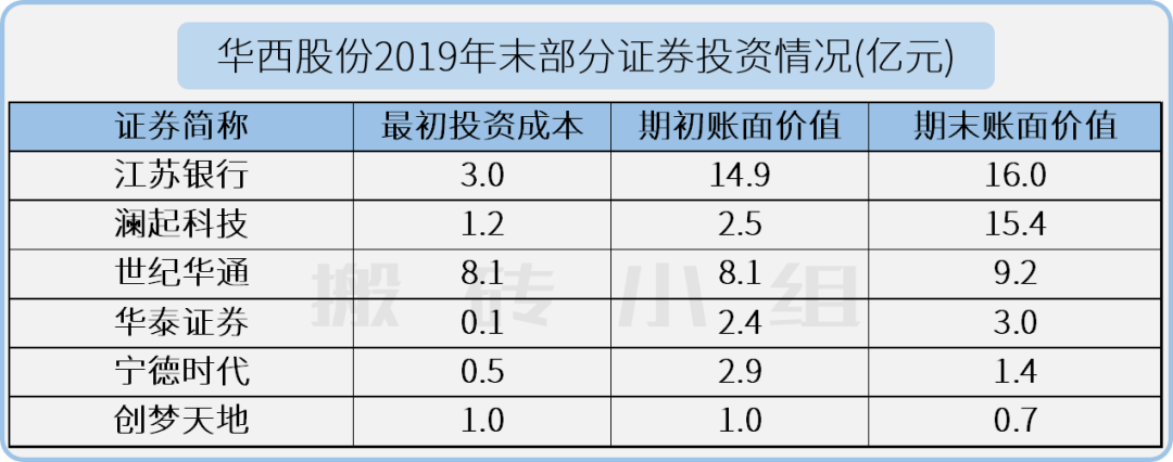 瞅瞅前两行,最初投了江苏银行约3个亿,现在账面价值已经达到了16亿元,公司2019年还出售了1.89亿的江苏银行和1.87亿的宁德时代股权;华西股份还投了澜起科技,这就是很多人梦寐以求的十倍股投资,可惜是别人家的。