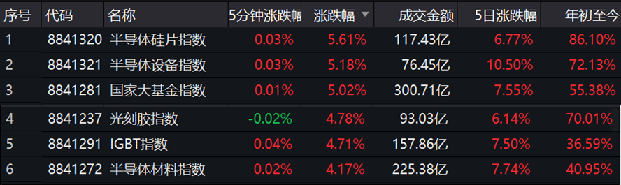 今天中芯产业链刺激,科技板块继续突突突,涨幅靠前的概念指数基本被半导体承包了,其中的材料和设备尤其突出。