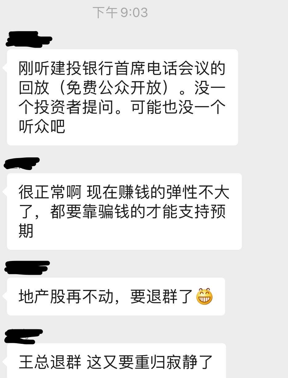 另一个感慨,也是金融地产群的,大家感慨连中信建投银行首席分析师的电话会议都没有投资者参加了,从这两个例子就能看出来,低估值板块的情绪已经冷到了极点。