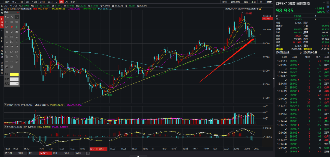 第二个是国债期货大跌。今天十年国债期货跳空低开,直接跌穿了18年初开始的上升趋势。但利率方面没有异动,所以这里要理解成是大类资产从债转向股。这种大类资产的趋势一旦确立会延续非常久的时间,股的趋势远没有结束。