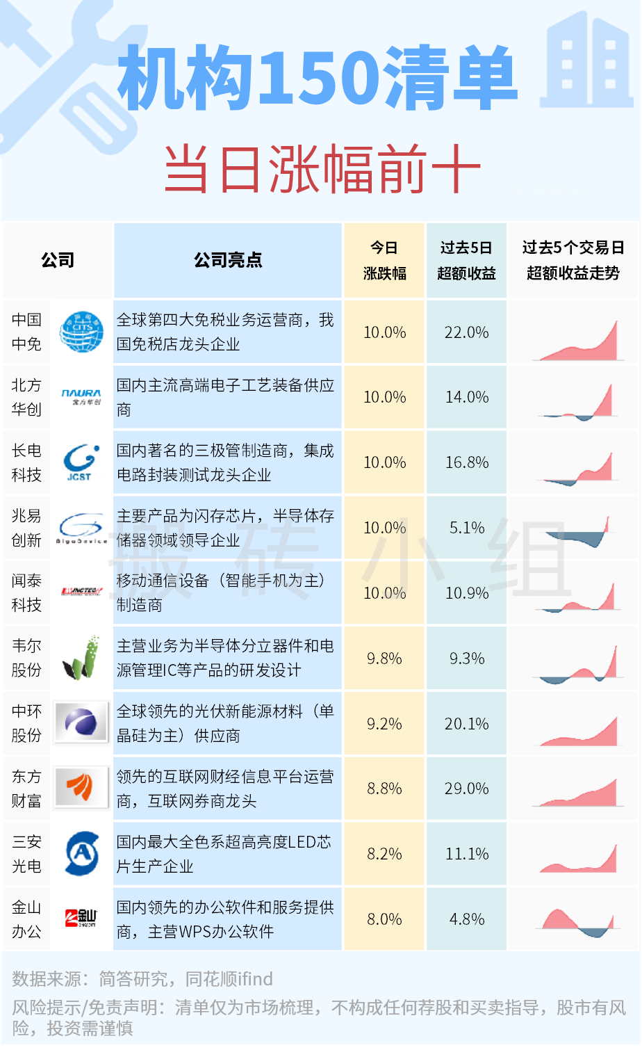 来看看今天的【机构150】涨幅前十: