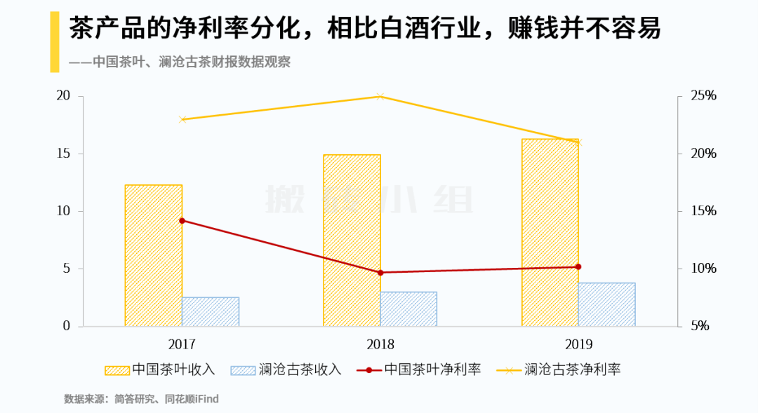 不过他们的净利率比起茅台这样的白酒企业还是差远了,虽然同样是消费品,但是相比白酒行业,茶产品赚钱并不容易。