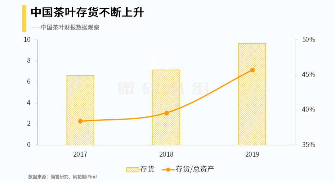 中国茶叶有一个很明显的特点,就是存货占比很大,2019年存货达到了9.67亿元,存货两年就增长了47%,占总资产比例也从38.4%变成了45.7%,呈现一路上升的趋势。澜沧古茶的存货也有类似的特点。