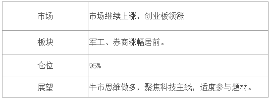 今天领涨市场的还是券商,下午东财涨停的那一刻就是号角,想耍小聪明做T的资金在这种多头强势的市场根本没有机会,所有卖出的仓位都要追着买回来!