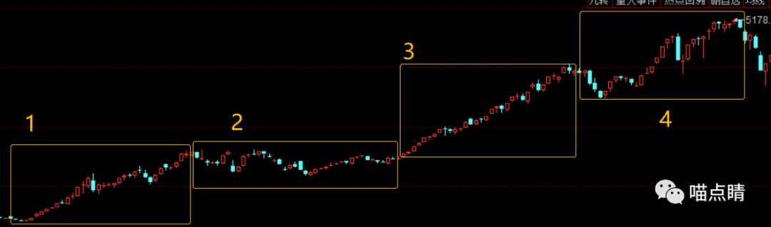而整个牛市阶段,一共出现过3次单日跌幅超过5%的大阴线,其中一次就发生在一阶段的上涨初期。剩余两次分别发生在二阶段的震荡期和四阶段的见顶期。