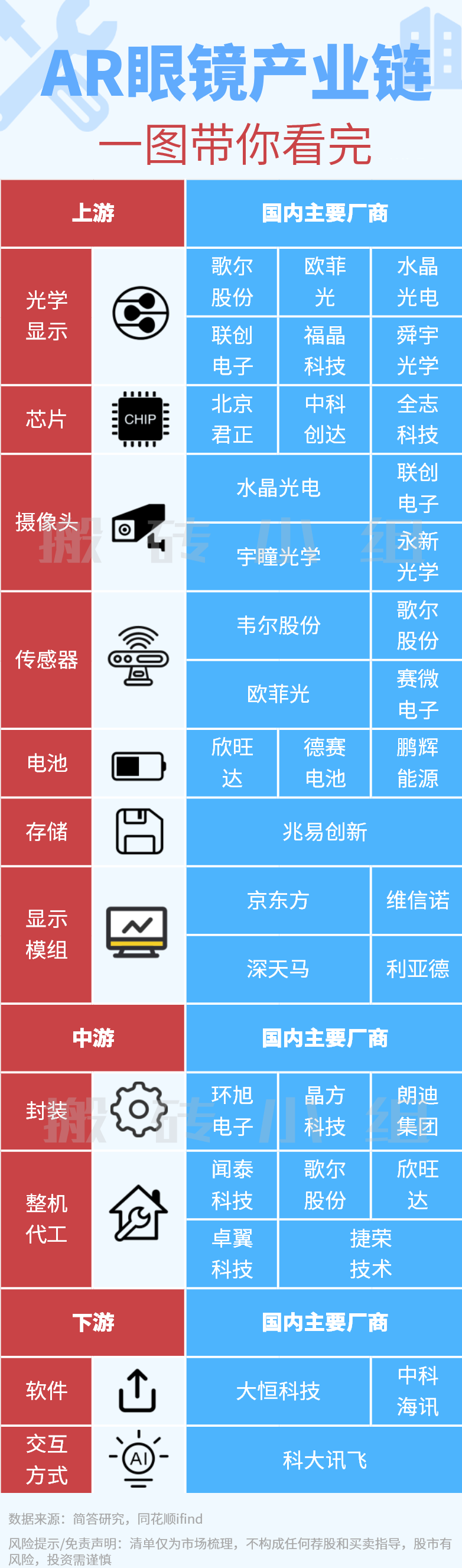 产业链上的其他公司,则是尽量给这些硬件巨头做配套。整个AR产业的生态里还需要上游的零部件与制造,下游的软件与应用等。我们大致整理了一下A股相关的产业链: