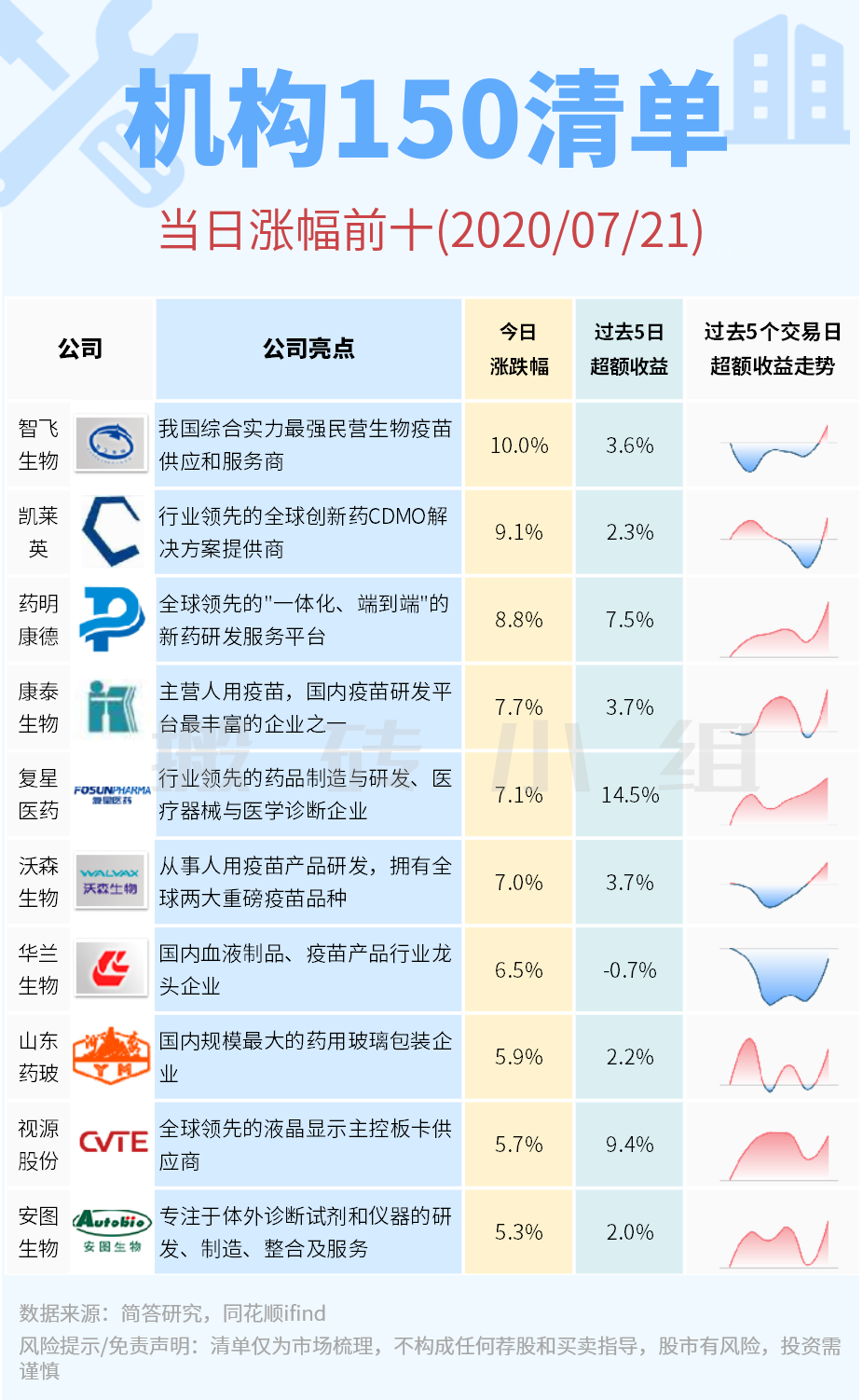 其中的智飞生物、复星医药、华兰生物等都是上周的老面孔,短期情绪都与疫苗相关。