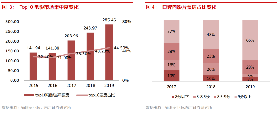 国内电影市场已经进入到了“内容为王”的时代,这里有两个数据,一是近年口碑向作品票房占比逐渐上升;二是每年TOP10电影的票房和占比也都在上升,都说明影视制作的马太效应很明显。