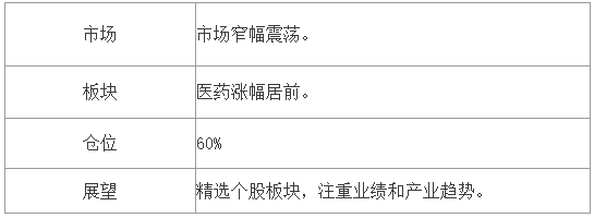 经过昨天市场反弹以后,今天指数震荡,创业板在医药的带领下反弹比较多。短期看当前还处于震荡区间内,要解放上半月的套牢盘是比较有难度的,这里考虑等市场明朗以后再把仓位推上去。