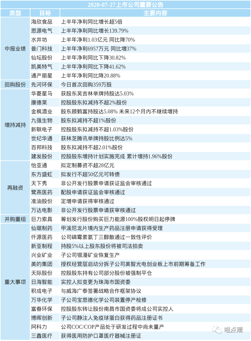 5、水井坊:公司2020年上半年营业收入8.04亿元,同比下降52.41%;净利润1.03亿元,同比下降69.64%。市场总体还是以消化库存为主,为保证市场健康可持续发展,公司控制了发货节奏,使得上半年收入、利润出现较大比例下滑。作为白酒行业的首份中报,显然没开好头,算是个小雷。