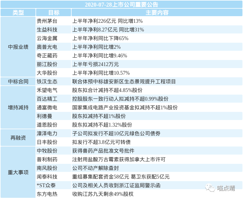 1、贵州茅台:公司上半年营业收入439.53亿元,同比增长11.31%;净利润226.02亿元,同比增长13.29%。其中,茅台酒实现实现营收392.6亿元,系列酒实现营收46.5亿元,公司发力的直销渠道已完成营收51.53亿元,已超2019年全年的70%。股王的业绩只取决于它自己。。
