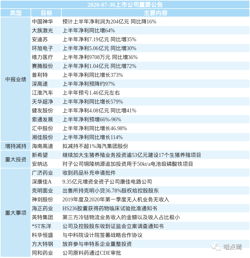 4、健友股份:公司上半年实现营业收入13.96亿元,同比增长18.64%;净利润4.08亿元,同比增长41.24%。公司国内多个产品进入优先审评程序,度骨化醇、米力农、肝素钠注射液、苯磺酸阿曲库铵注射液等7个ANDA申请获得美国FDA批准。