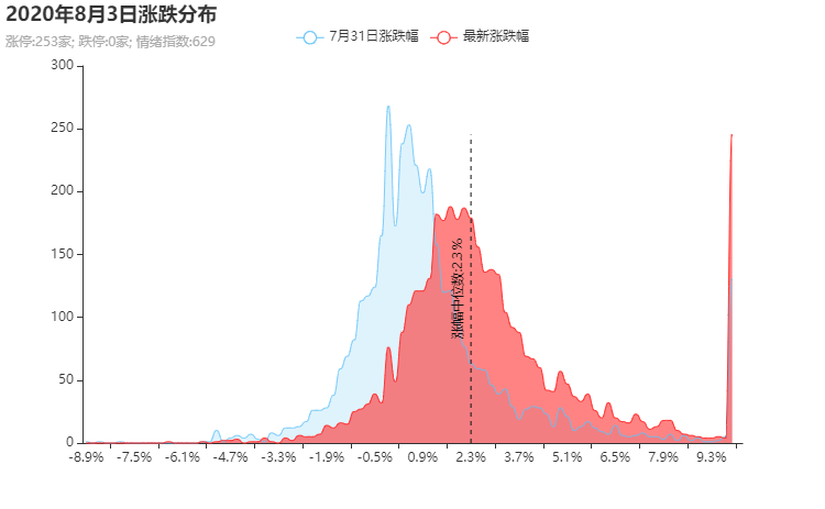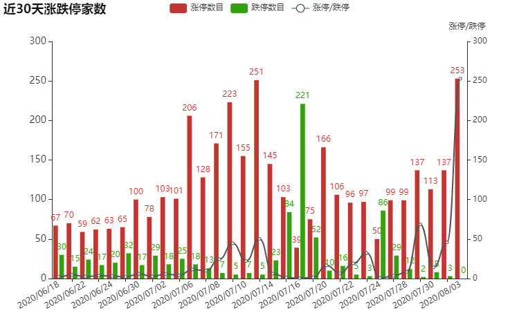 今天市场高开高走,各大指数都收中阳线,创业板50还创了新高,成交额同步放大,涨停板数量达到253家,8月的第一个交易日多头表现非常积极,算是开了个不错的头~