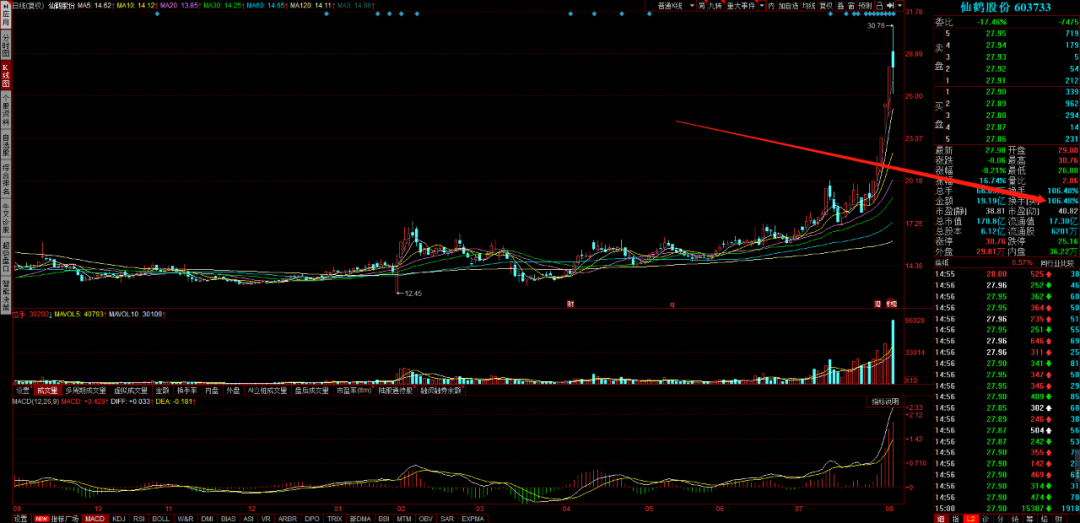 今天盘面上最牛的是仙鹤股份,全天换手106%,龙虎榜上这票买一还是个机构,我第一眼看到的时候感觉这数据出问题了吧??但后面想了一下,这是由于系统没有把可转债转股的量算进去。