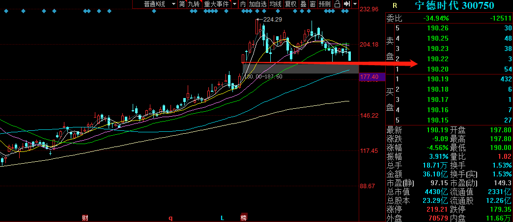 今天跟前段时间不同的是,除了疫苗以外,其他几个行业的大龙头都出现了中阴线,比如宁德、立讯这些机构扎堆的品种都有接近-5%的中阴线,图上看如果再跌一下就要破位了。