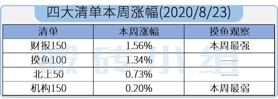 这周财报150的走势最好(1.56%),其次是摸鱼100(1.34%),北上50(0.73%),最惨的是机构150(0.20%)。