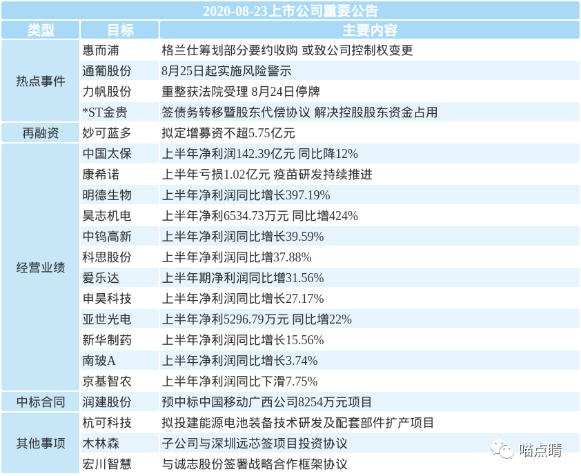 1、惠而浦:广东格兰仕正在筹划部分要约收购公司股权事项,此次要约收购可能导致公司控制权发生变更,公司股票今天起停牌。格兰仕以微波炉产品起家,是中国家电业具有广泛国际影响力的龙头企业之一。继美的合并小天鹅后,家电行业或又迎产业整合,而格兰仕目前还未上市,想象空间不小。