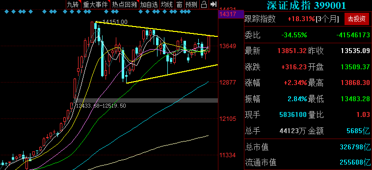 从日线看这里是个非常重要的点,深证成指已经到收敛三角的上沿,突破也就一步之遥。沪深300也是直接干到了前高附近,如果周一继续突突就新高了。