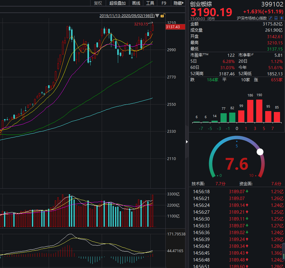 成交额方面,今天的创业板成交了3176亿,虽然还没超过7月的高点,但这距离上证指数的成交额也就只有280亿的差距了,要知道创业板指市值只有10万亿,而上证的市值有43万亿。