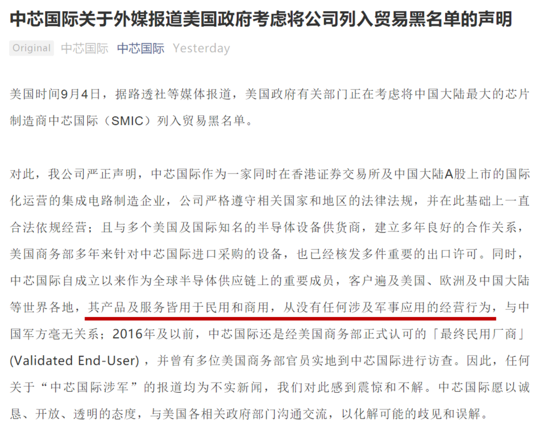 国内媒体很快大幅报道,很多都提到了对岸要搞中芯国际,是因为它涉及到军用业务,连中芯国际自己都出来发声明,说它的产品只用于民用和商用,对相关错误报道感到“震惊”。