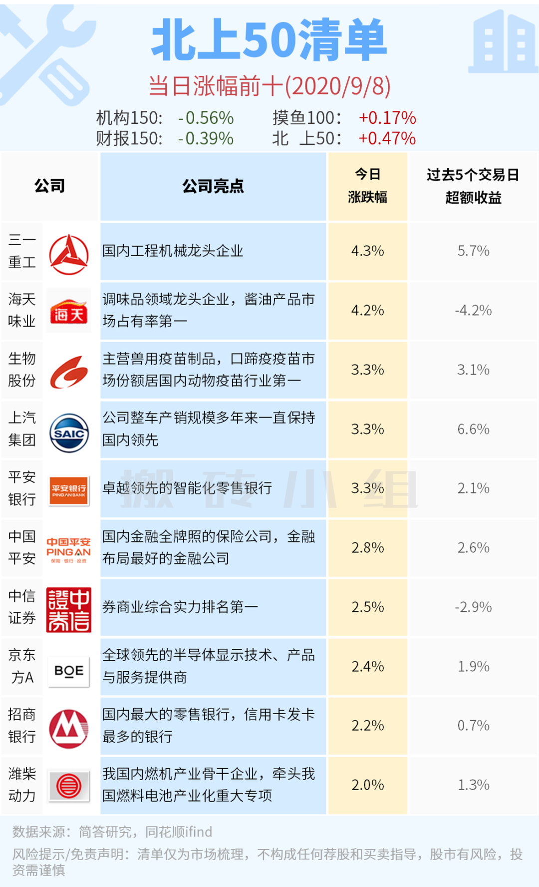 虽然北上大幅流入,但从北上50看没感觉到特别强势。涨幅前10里大部分都是周期和金融,科技、医药、消费这三家马车只有2家公司上榜,市场最近的选择比较明确,跌下来以后往顺周期方向流入了。