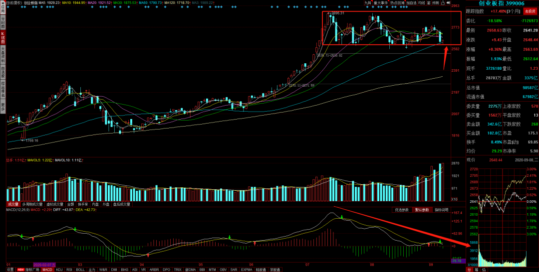 无论是涨还是跌我感觉都有可能,所以这里我只能用中性仓位来应对。但是从图上来看,这个位置如果创业板小票开始崩,创业板指可能会破箱体下沿,大指数破位是容易引发市场一轮集体下跌的,现在这个位置我略微偏谨慎一些。