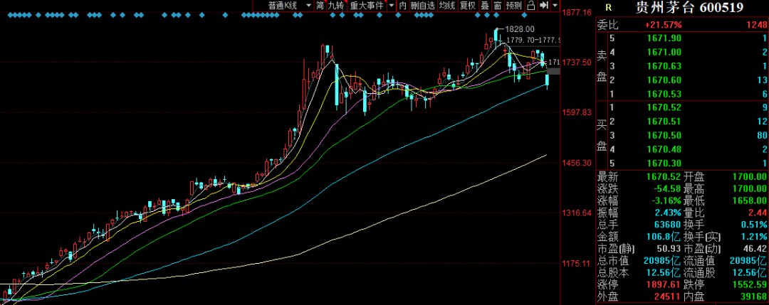今天三驾马车里的医药和消费都倒了,大家抱团的龙头票都有解散的感觉,茅台、恒瑞的图都是放量跌,茅台还留了个缺口,技术上当然不是那么好看了。