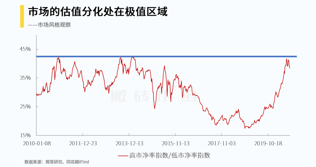 这个数据是高市净率指数/低市净率指数,比值越大,代表高估值板块涨的越多,也越说明市场估值分化大;比值越小,越体现估值回归。