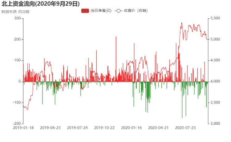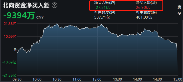 北上总体今天流出一点点,但分开看北上资金出现了明显比较大的分歧,沪股通流出27.8亿,深股通流入26.9亿,呈现完全不同的走势。结合盘面看,我估计北上是在卖金融买成长。
