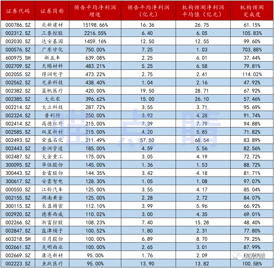 在剔除了小基数、新股等干扰项后,我们还按照3季度预增利润平均增速降序列了一份清单,并相应的测算了机构全年业绩预测值的完成度,下面分享下其中TOP30的选手,大伙可以参考一下。
