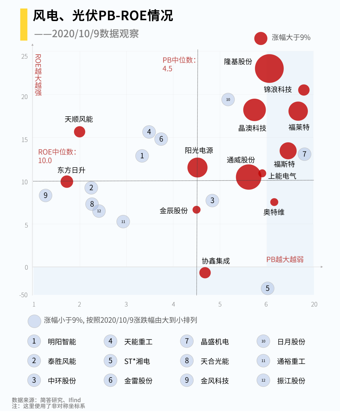 我们把今天的涨幅做到了光伏风电PB-ROE图当中,将今日涨幅超过9%的公司用红色的气泡表示,如下。