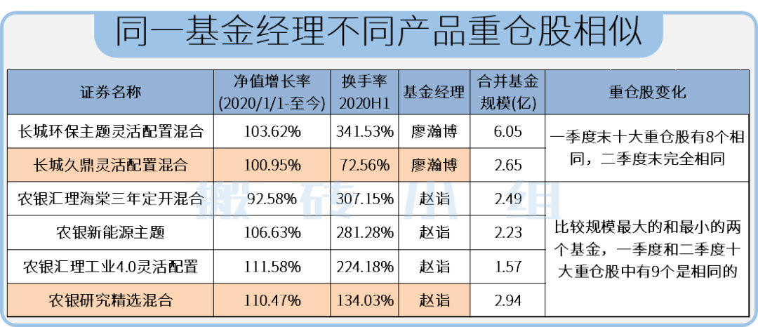 另一个发现,就是上面的表单有几个基金,基金经理是同一人,业绩很好,合起来看下就能发现同一基金经理,持仓换手差异巨大,这里面究竟是软佣支付必须把费用做出来,还是大基金给小基金抬轿打名气??