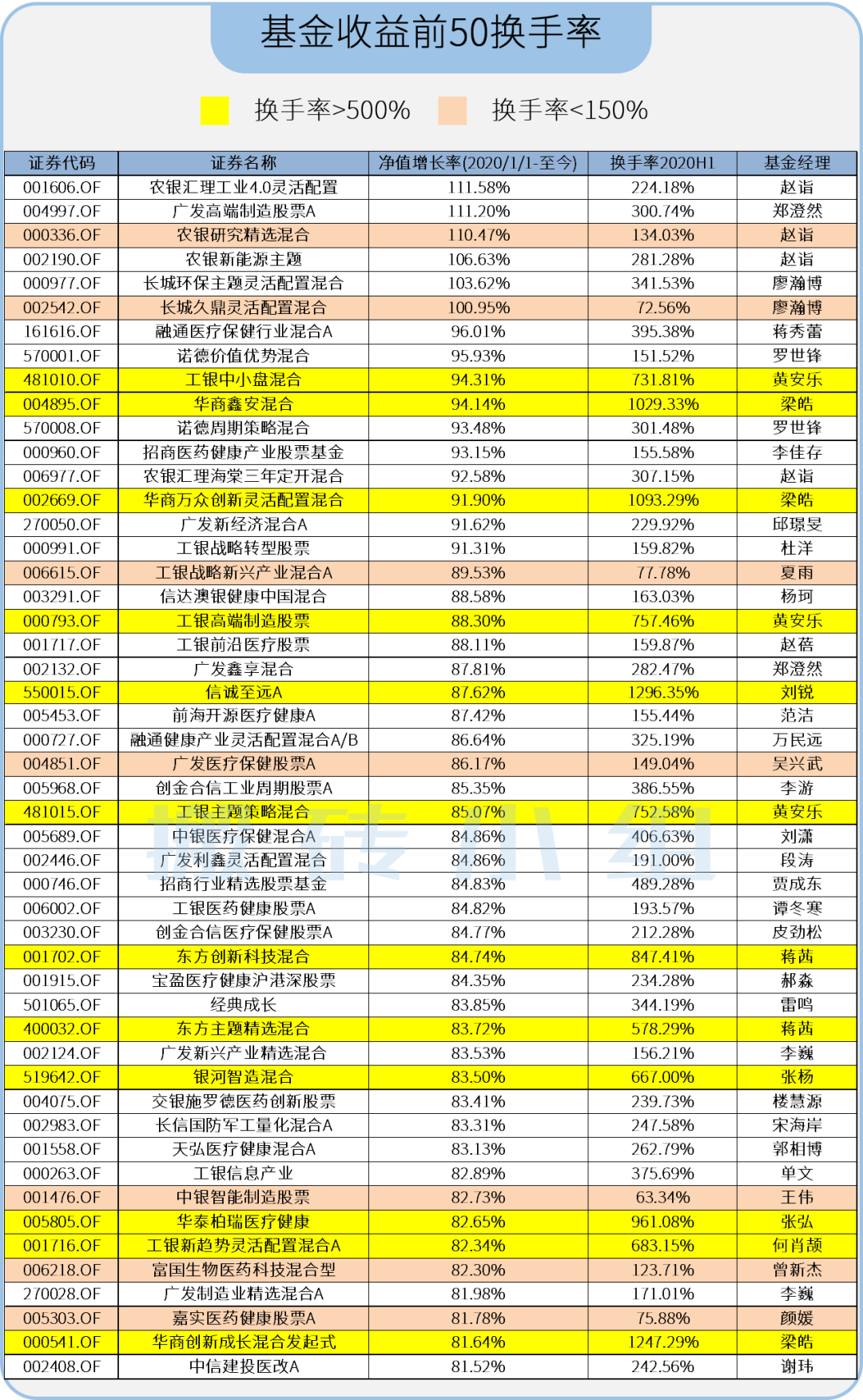 表里面换手率最低的是中银智能制造,换手率只有63%,收益率是82%。第二低的是长城久鼎灵活配置,换手率72%,收益率100%,都是陌生面孔,小基金新锐基金经理,这个数据还是有点震到我,估计这就是周末基金经理小伙伴提到的牛鸡。
