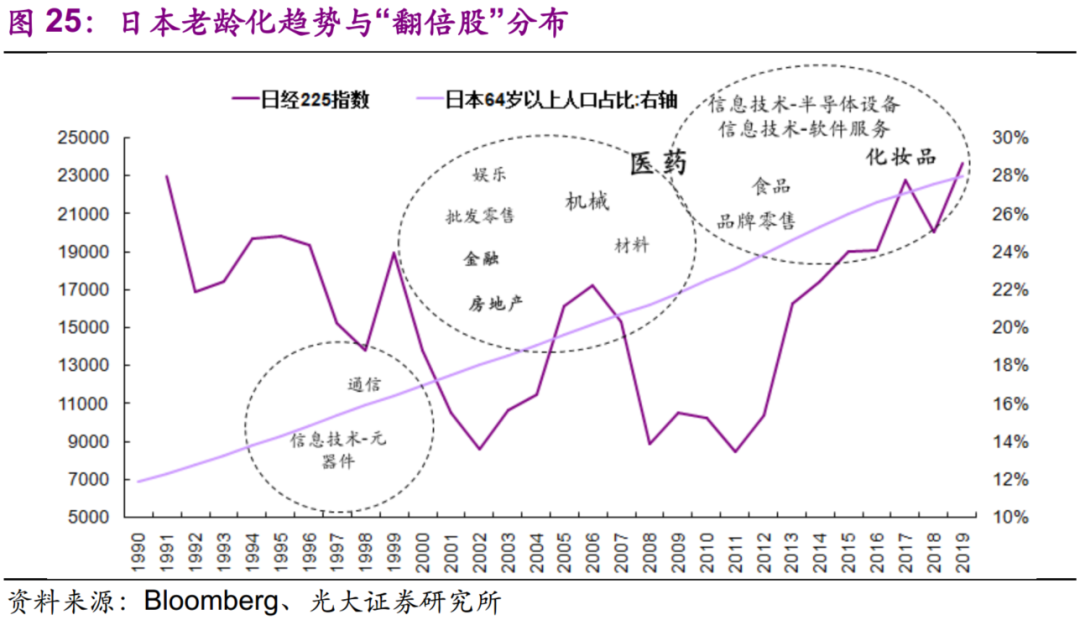 在2000年以前,日本的牛股多出在日本领先的通信、半导体制造行业,2000年到2008年这段时间,随着全球宽松积累泡沫,金融地产有所表现,2008年金融危机以后,全球增长熄火,转向内需拉动经济,化妆品、食品、零售等行业牛股辈出。当然,整个老龄化的过程中,医药都是牛股集中营。