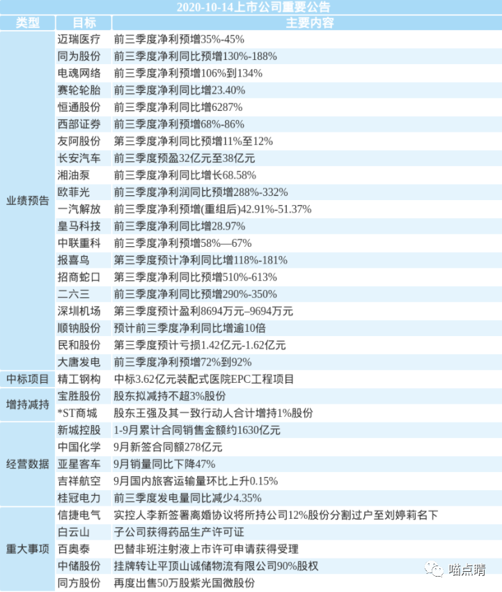 1、迈瑞医疗:公司前三季度预盈49.56亿元至53.23亿元,同比增长35%-45%,三个季度就超过去年全年业绩了。此外,公司全年预盈为60.8亿元-65.5 亿元,同比增长30%-40%。外边受疫情影响不小,对监护仪、呼吸机、输注泵的需求量仍维持在较高水平。