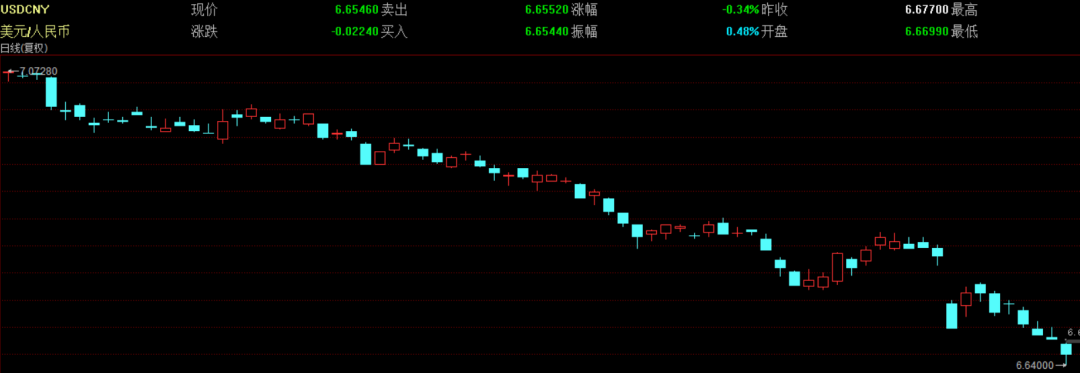 2、美元兑人民币昨日继续跌,盘中一度触及6.64,跌破了19年的大平台,创造了自2018年7月以来的新低,换句话说就是人民币又升值了。这一波趋势持续了快5个月,期间升值了5000点属实有点猛,前一段我们下调了外汇风险准备金率就是为了降温,但药效也就顶了几天。