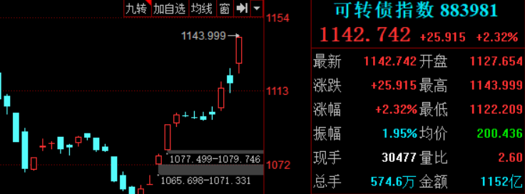 2、最近的可转债真是疯了,昨天在两市低迷的背景下怒涨2%,整个转债指数顺势创了新高,看图感受下这凌厉的走势。20cm大刀已经玩腻了,现在都改玩100cm的,昨天正元转债一根176%的穿云线差点涨到屏幕外头。。