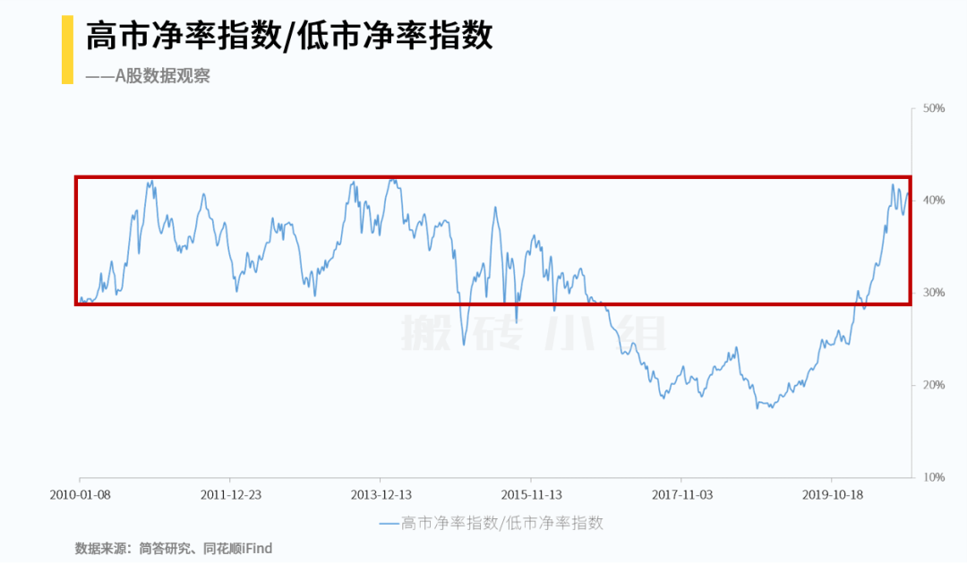 这图是高市净率指数和低市净率指数的比值,在10年-15年有很好的区间指示作用,一到箱体顶部就往下,一到箱体底部就往上,市场的风格切换是比较有节奏的。