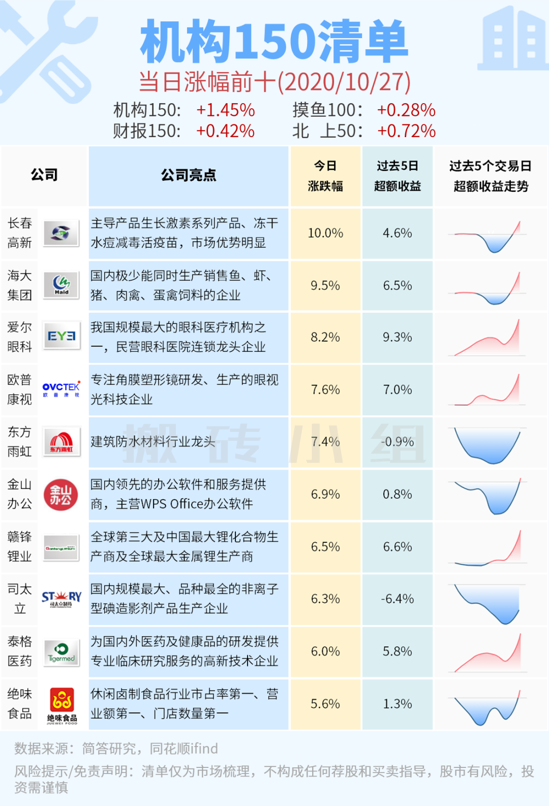 今天四大清单都跑赢了大盘,涨幅最高的机构150,涨了1.45%,机构在自己的核心持仓上做了波反扑。