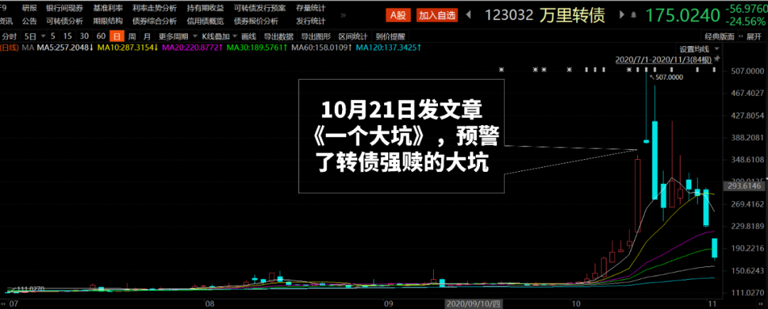 万里转债宣布强赎,今天暴跌24.56%,我们在上上周的文章里给大伙预警过可转债的强赎是个大坑,里面就提到了万里转债。
