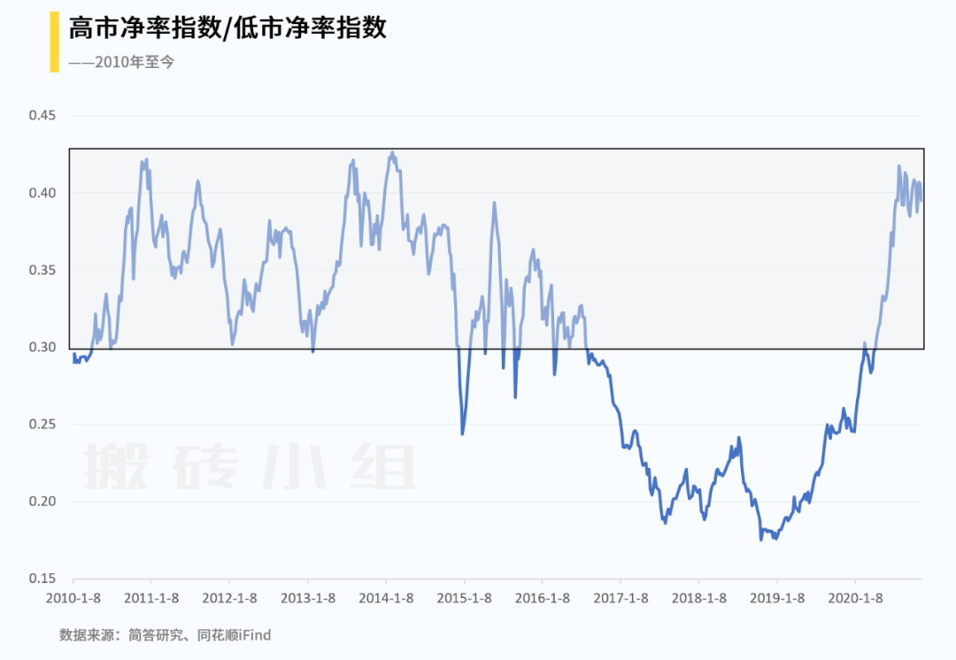 再看一个图,我跟踪了很久的PB比值指数,在箱体上沿已经震荡很长时间了,向下是有空间的,从相对收益角度看低估值性价比更好。